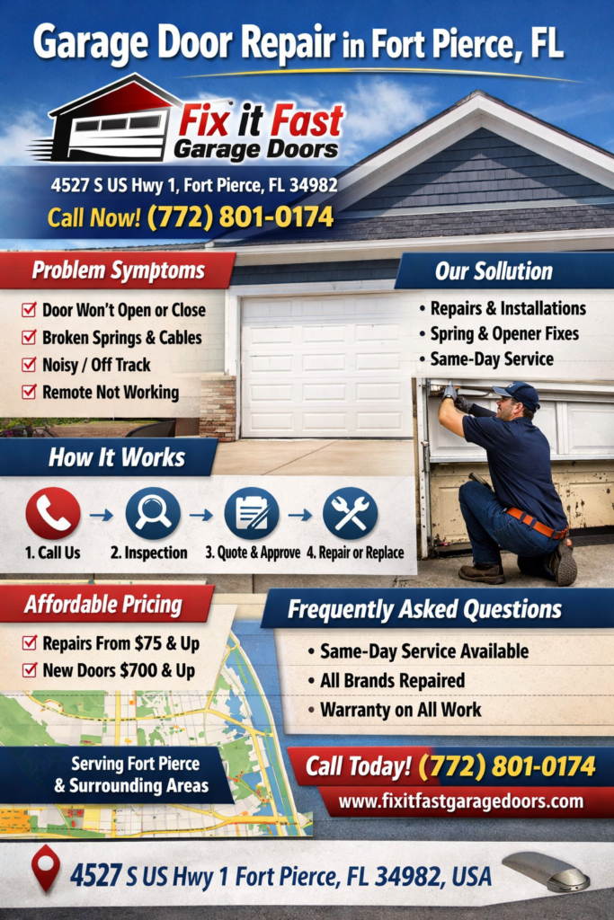 Need garage door repair in Fort Pierce? Fix it Fast Garage Doors offers reliable service at 4527 S US Hwy 1. Call (772) 801-0174 for fast help today.